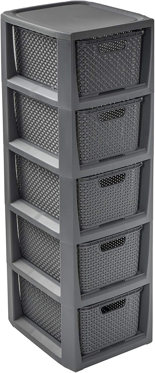 Das Regal überzeugt durch seine Vielseitigkeit und Stabilität. Die fünf Körbe bieten ausreichend Platz für Kleidung, Accessoires oder Badezimmerutensilien. Dank der vormontierten Lieferung ist es sofort einsatzbereit. Das Material ist pflegeleicht und lässt sich einfach reinigen, was es besonders alltagstauglich macht.
