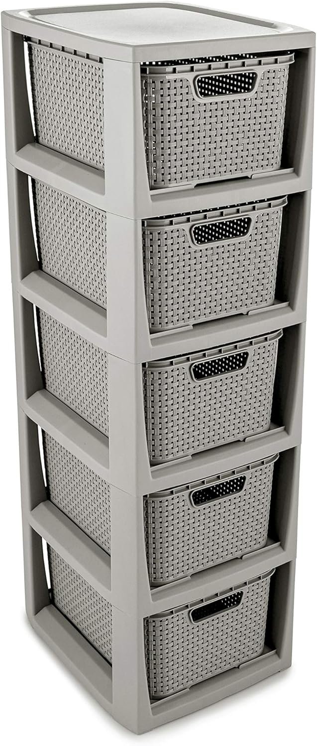 Dieses Kunststoffregal mit fünf herausziehbaren Körben im stilvollen Rattan-Design ist eine einfache und elegante Lösung, um Ordnung im Haushalt zu schaffen. Mit seinen kompakten Maßen von 29,5 x 24 x 80 cm passt es in Badezimmer, Schlafzimmer, Flur oder Wohnzimmer. Dank des schlichten skandinavischen Stils fügt es sich harmonisch in jede Einrichtung ein.